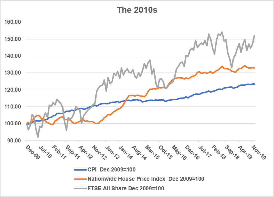 The UK stock market, as measured by the FTSE All-Share Index, produced capital growth of over 50% in the 2010s, despite all the political traumas. That is equivalent to 4.3% annually, more than double the inflation rate. The progress was not smooth – the grey line on the graph does gyrate about somewhat – but neither was it an unnerving roller coaster.